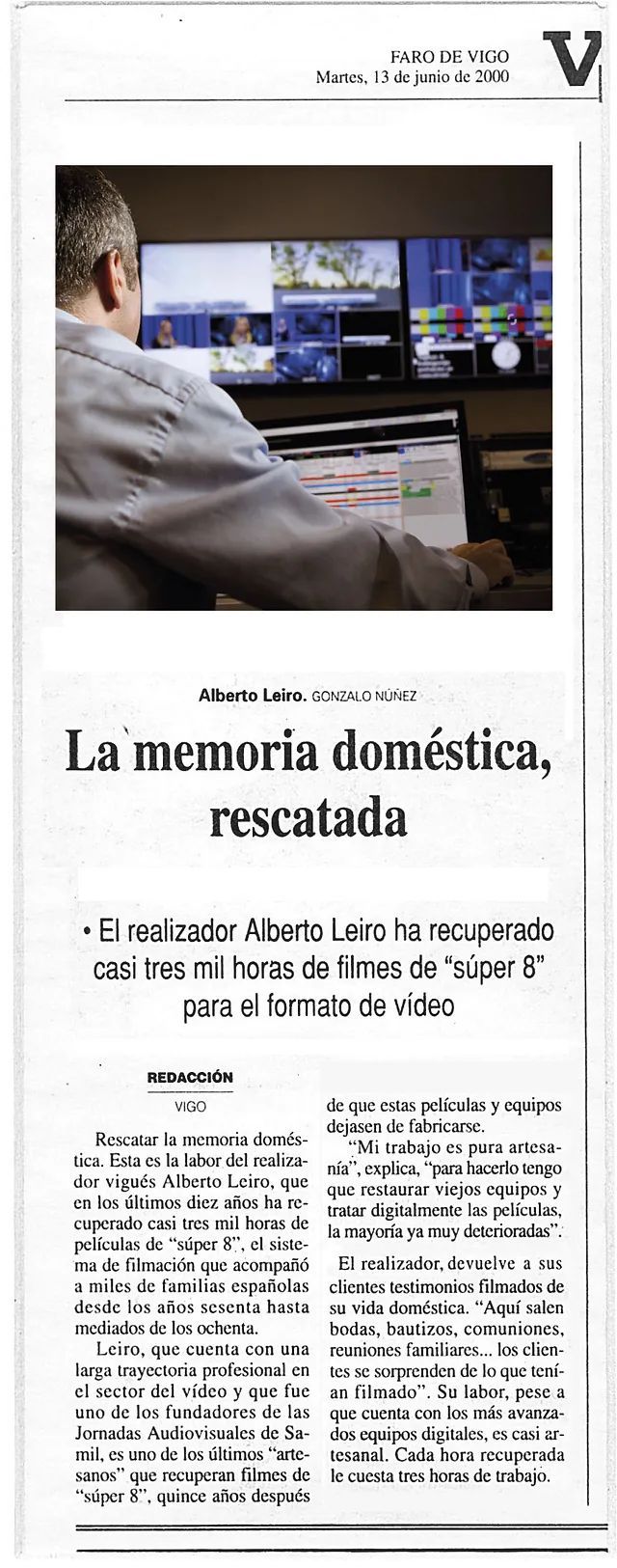 En Leiro Audiovisual somos una empresa ubicada en Vigo, especializada en realizar el volcado a digital vídeo, audio y formatos de cine Super 8, 16mm y Pathé 9,5mm. Los más de 35 años de experiencia que tenemos en el sector, nos avalan.